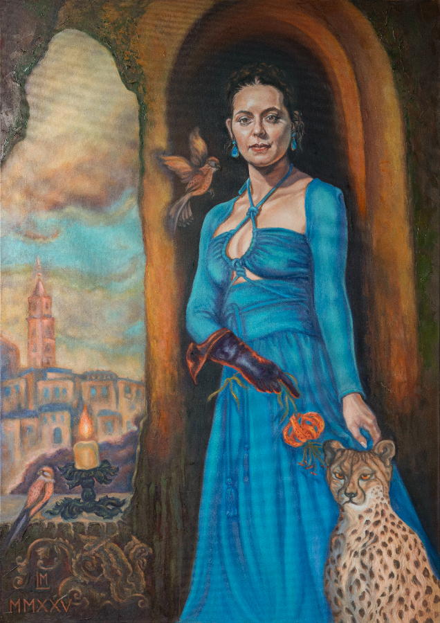 As a Ukrainian Canadian artist, I work on pieces that honour the fundamental traditions of realism with its ability to add emotional depth to my paintings, but also incorporate the esthetics of folk art known as “Ukrainian Baroque”, with its maximalist use of visual space and rich decorative details. Whether my subjects are caught in motion or captured at a moment of quiet contemplation and profound stillness, they invite the viewer to slow down and immerse in timeless beauty of vivid complementary colours, meticulously crafted backgrounds and opulent costumes – all that to create an enchanting visual space and to tell their stories. Aiming to fill the canvas with their intense presence, I weave a narrative connecting the viewer with their inner lives at moments when they are closest to nature. A tangible fairy tale vibe comes from building on the historical tradition of portrait painting by old masters, and my overarching fascination with the past and local lore.